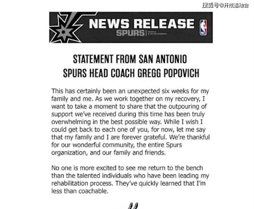 波波维奇回忆起与球队的频频互动,共享了他与球员们的趣事,强调团队的凝合力和彼此间的赞助。他默示,我方长远感受到来自马刺各人庭的辞谢,相称是在这个贫窭时间,各人的情怀和饱读吹让他倍振作斗。他瓦解,尽管还需要本事还原,但他已迫不足待念念重返球场,接续指导球队前进。